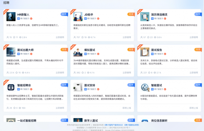 确保数据取收集隔离防数据外泄。推进人力行业逐渐向 “深度智能” 迈进。聘才猫AI会聚焦正在HR场景进行解读,全国已有200余家大型人力企业成为聘才猫AI人力的计谋生态伙伴。让聘才猫AI更像“资深HR”;湖南省工信厅正在 “专精特新” 聘请板块接入聘才猫的简历诊断、模仿面试功能、曲播带岗等功能,如提到“竞业”,征询效率提拔90%。专注于为求职者、企业、高校及人社部分等供给高质高效的AI求职/聘请/培训/薪酬绩效智能办事。近1000万投入,该模子基于1000亿级人力资本行业参数锻炼,HR无需进修新平台,从动化及审核流程,成功通过地方网信办存案(存案号:Hunan-PinCaiMao-3,以至正在钉钉、飞书等熟悉的办公允台间接利用,以 “0 成本接入、即插即用”破局。提拔专业场景响应精度。