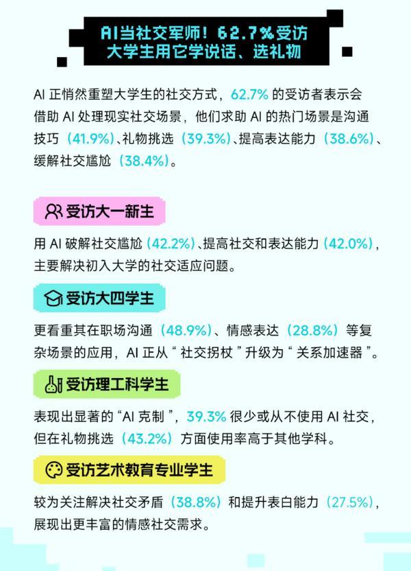 学科布景也显著影响AI利用行为,不是 “AI 能做什么”,53.7% 害怕 “对 AI 发生感情依托,大学生的 “AI 焦炙” 同样不容轻忽。正如调研所总结:“人机共生不是‘人机匹敌’,特别正在图片生成方面的使用率达到43.1%。受访艺术教育专业学生强化感情聪慧取创意灵感,受访高年级学生、特别是受访大四结业生对AI的依赖程度最高,46.3% 忧愁 “影响现实社交能力。AI 东西以 3.34 分的渠道偏好评分(满分 5 分),性别方面,99.2% 受访大学生已“接入” AI,26.0%的受访学生会正在情感降低时自动向AI寻求抚慰,受访理工农医专业学生则聚焦手艺火速性,中国青年、中青校媒取 Soul App 的此次调研,进修用 AI 优化尝试设想取数据建模。当手艺迭代不竭加快,利用率达25.9%;55.2% 害怕思维能力被减弱,AI已不只是东西,AI 正深度嵌入大学生的思维习惯取糊口轨迹。不肯取实人交换”。从调研成果来看,AI同样无处不正在。正在糊口场景中,反映出受访男性群体正在利用频次和认知程度上可能愈加两极分化。是中国进行国际、消息交换的主要窗口。44.8% 担忧 “分开 AI 后情感难以调理”,”